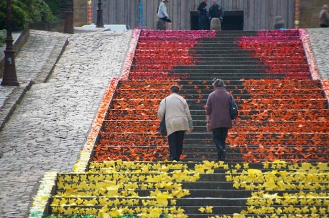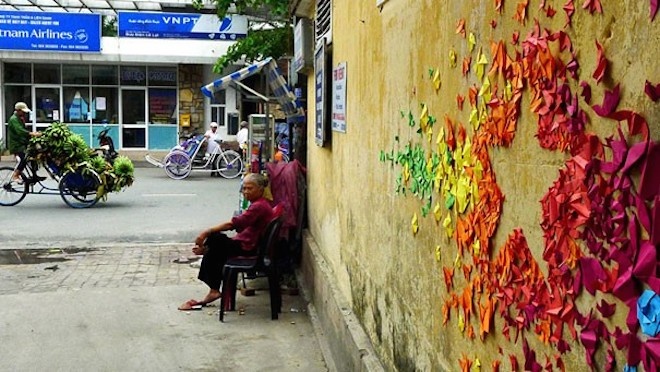 | Một số tác phẩm của cô gái Pháp đòi hỏi rất nhiều sự nỗ lực và thời gian. "Để có thể tạo thành con đường hạc giấy, tôi đã từng nhờ các bạn học sinh, thành viên tổ chức phi chính phủ, tình nguyện viên giúp đỡ, cùng nhau gấp hàng ngàn mẩu giấy khác nhau" - cô nói. |