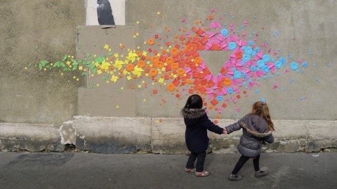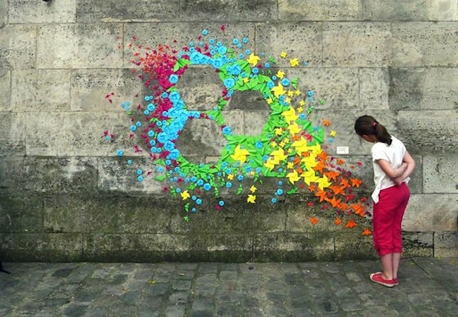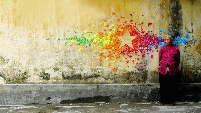 | Trong khi hầu hết mọi người thường sử dụng sơn phun để mang lại màu sắc cho các bức tường và vỉa hè thì cô lại dành cả ngày gấp và lắp ráp giấy theo phong cách origami. |
