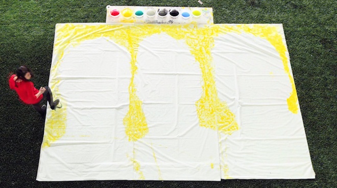| Cô nhúng bóng vào các chậu màu và lăn qua lăn lại trên tấm vải trắng khổ lớn. Mọi thao tác được cô làm ngay trên sân cỏ. |