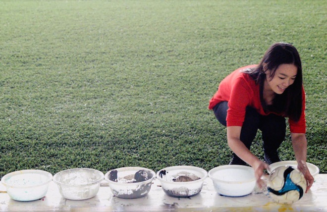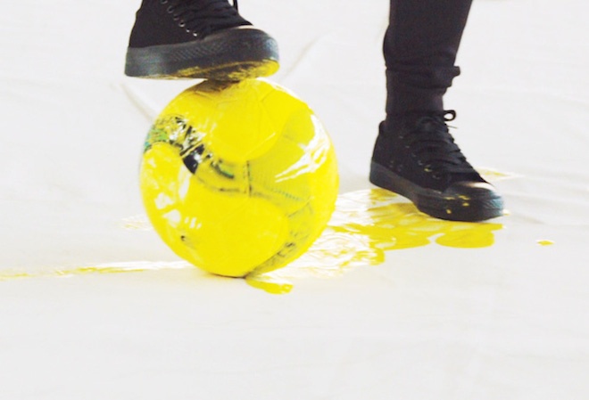 | Tuy nhiên, bức vẽ không chỉ được thực hiện một cách đơn thuần. Hong Yi đã khiến mọi người ngỡ ngàng, chú ý khi sử dụng chính trái bóng đá thay cho bút vẽ thông thường. |