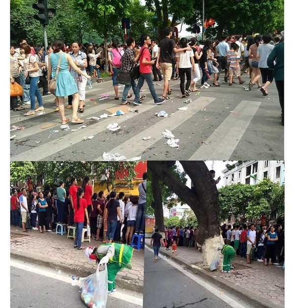 Những hình ảnh đường phố tràn ngập rác trong ngày lễ được chia sẻ trên các diễn đàn mạng. Trong số đó, có khoảnh khắc khi đông đảo người dân xem biểu diễn, đằng sau các công nhân cặm cụi nhặt rác. "Chúng ta cần phải làm cái gì đó mạnh hơn nữa để thay đổi tình trạng này. Mọi người hãy tôn trọng và bảo vệ môi trường sống của mình, đừng xả rác một cách vô thức và ơ thờ như vậy" - một facebooker chia sẻ. Ảnh: Otofun.