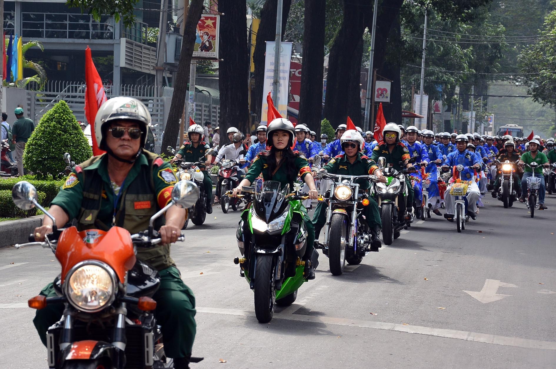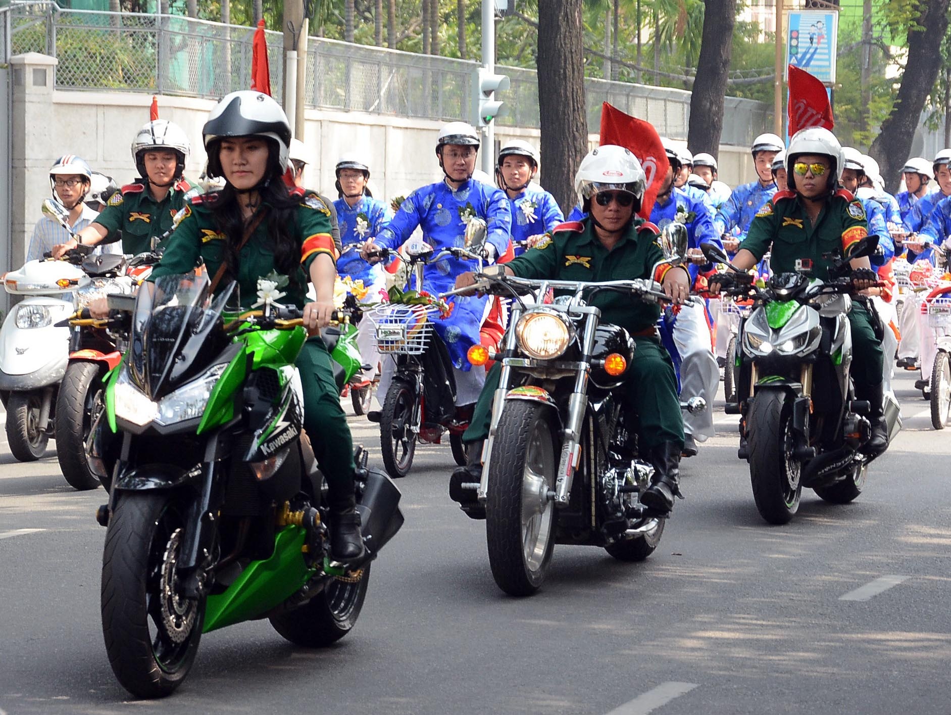 Trong lễ cưới tập thể của 100 cặp đôi diễn ra sáng 15/10 ở Sài Gòn, đoàn diễu hành được đội mô tô dẫn đường, trong đó có duy nhất cô gái thu hút sự chú ý của nhiều người.