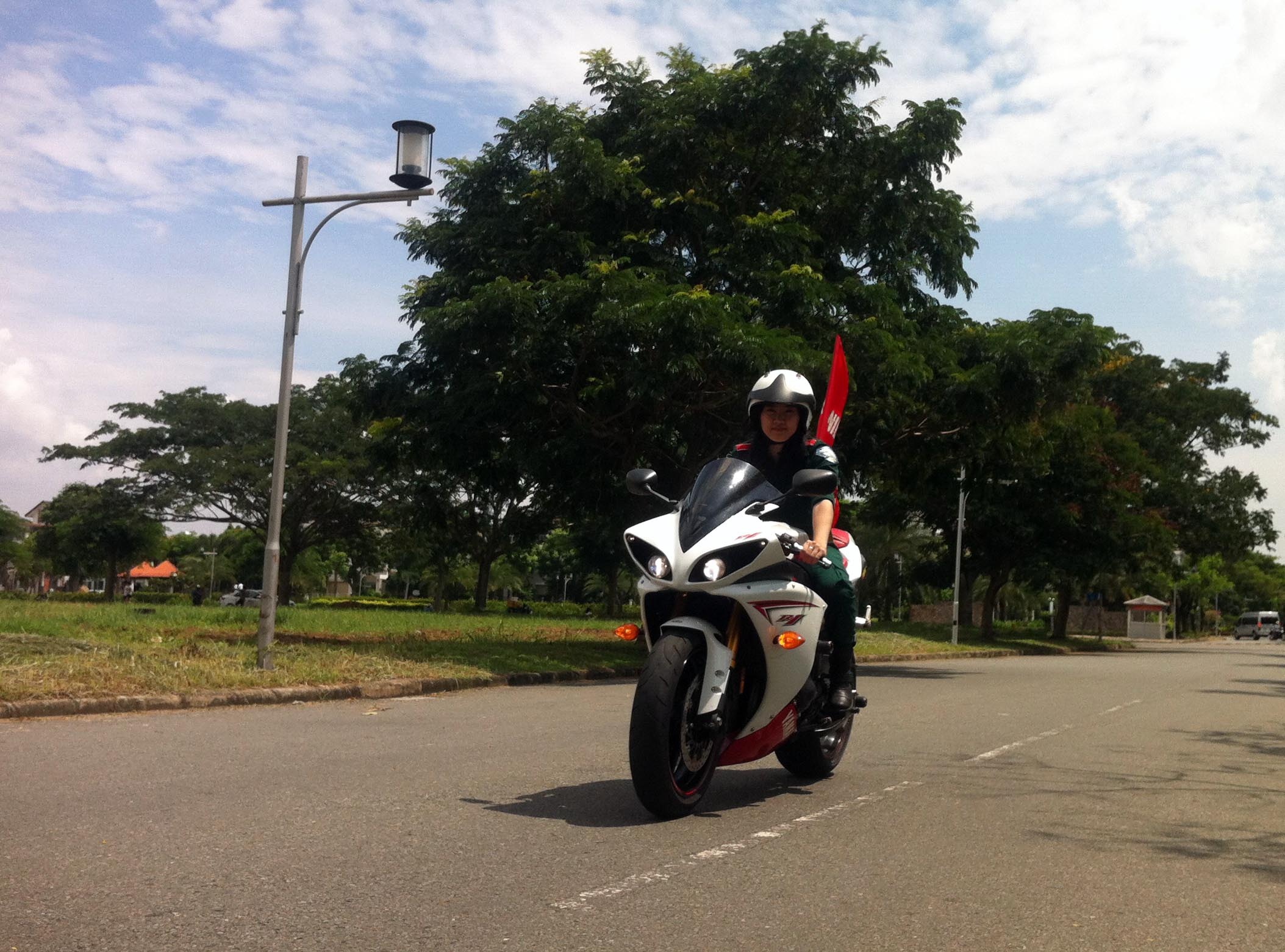 | Thanh Tú mạnh mẽ trên chiếc mô tô hiệu Yamaha trong một hoạt động diễu hành mô tô ở Sài Gòn. |