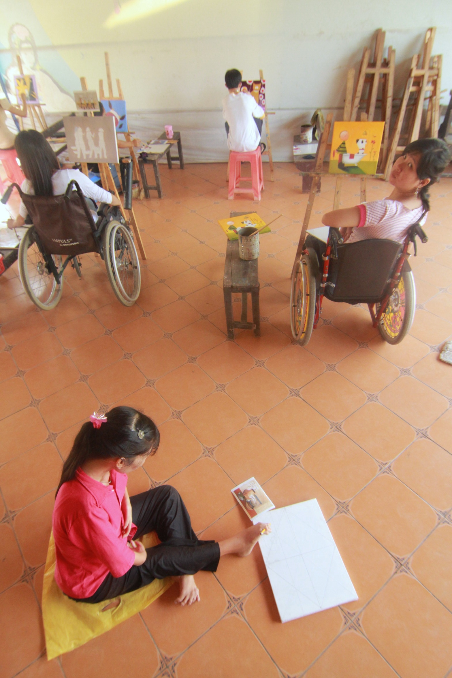 Huỳnh Thị Xậm (36 tuổi, quê Hậu Giang) bị khuyết tật cả tay và chân từ khi lọt lòng mẹ. Vào trung tâm từ năm 2006, ban đầu Xậm theo học tin học văn phòng, thuê thùa, sau đó cô học vẽ tranh. "Tôi không có năng khiếu vẽ tranh, nhưng đôi chân làm được gì thì tận dụng. Tôi nghĩ mình sẽ làm tốt và quyết tâm thì sẽ được", Xậm chia sẻ. Trong ảnh, Xậm lấy đồ nghề vẽ để trên xe lăn của cô một cách dễ dàng bằng bàn chân phải.