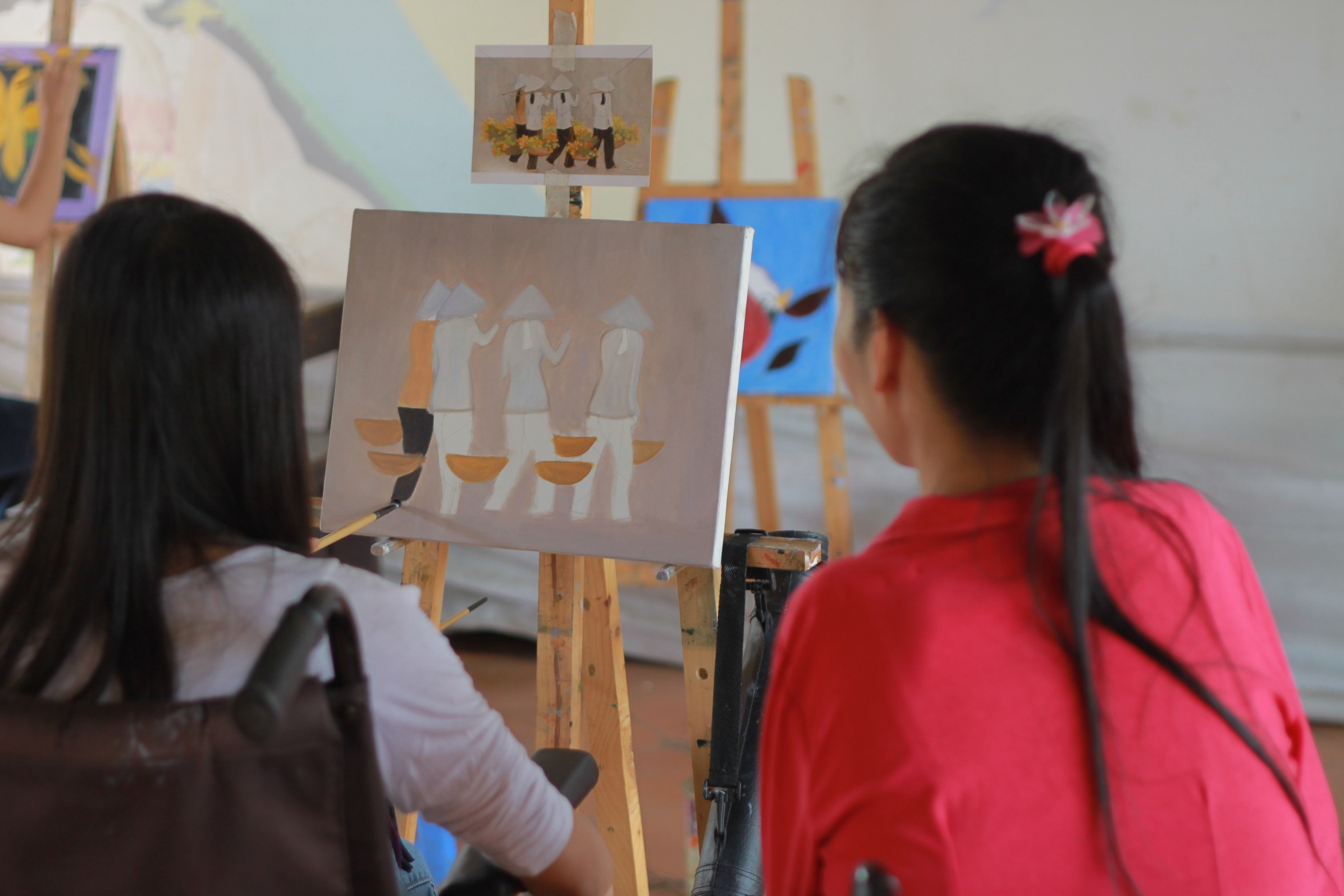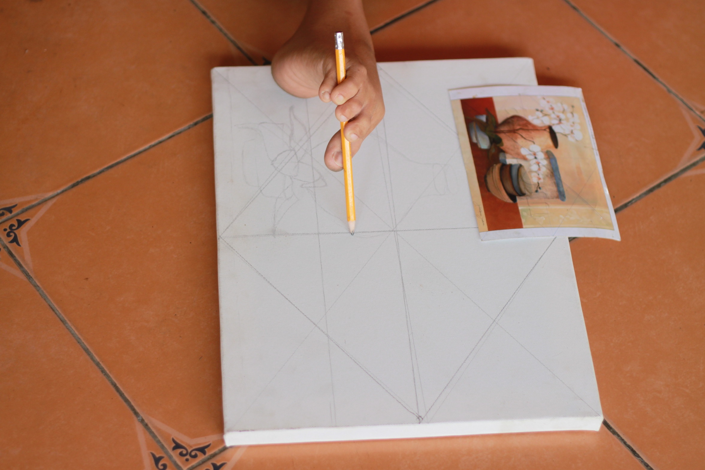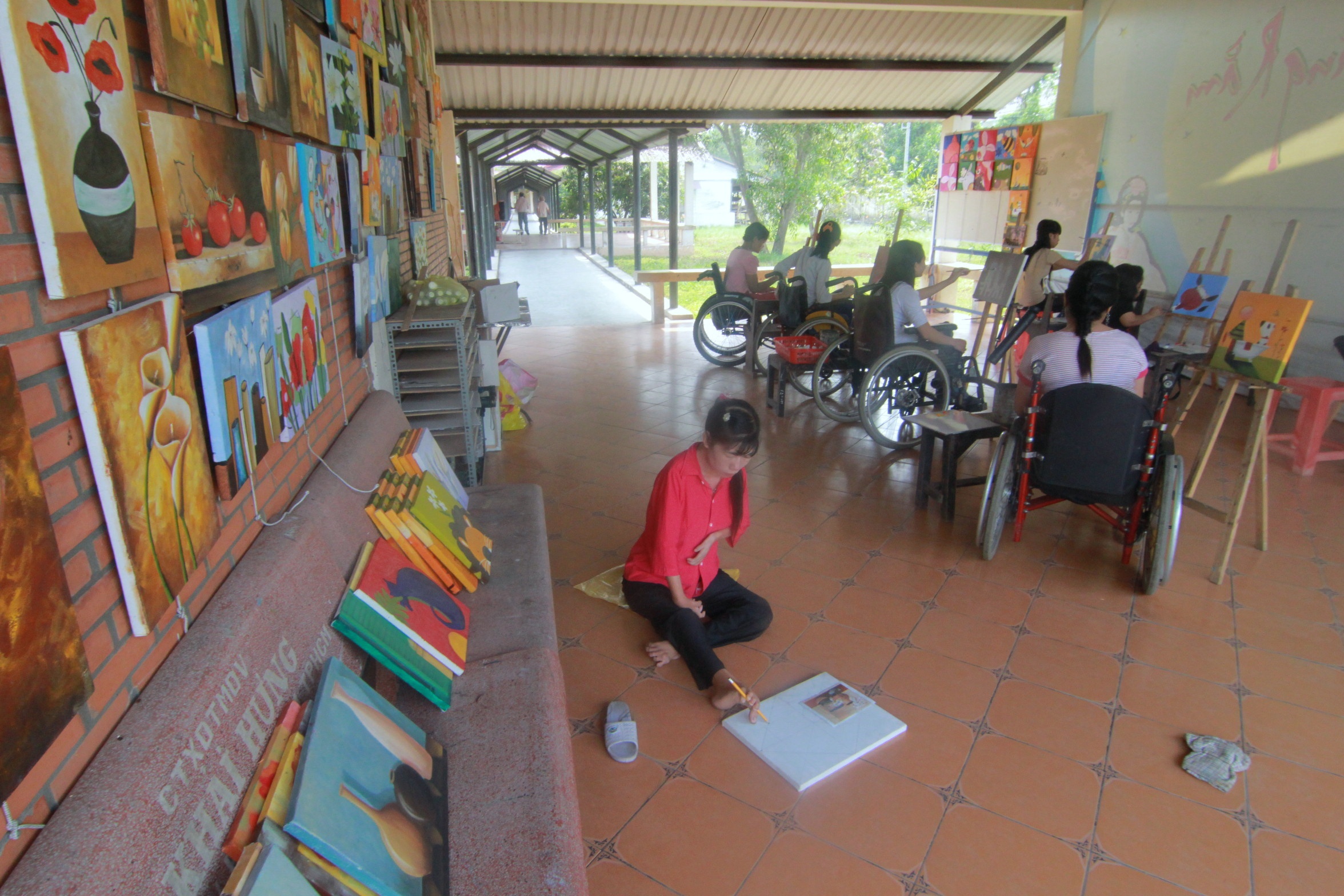 Tại lớp học vẽ tranh của Trung tâm dạy nghề cho người khuyết tật và trẻ em mồ côi Hóc Môn (TP.HCM), trong khi những người khuyết tật khác vẽ bằng tay thì Huỳnh Thị Xậm phải dùng bàn chân.