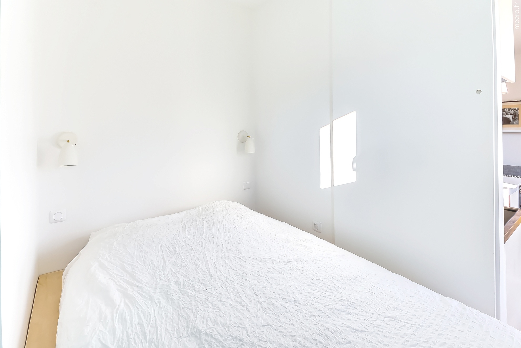 Phòng ngủ tông màu trắng với thiết kế giống một cabin nhỏ nhắn.