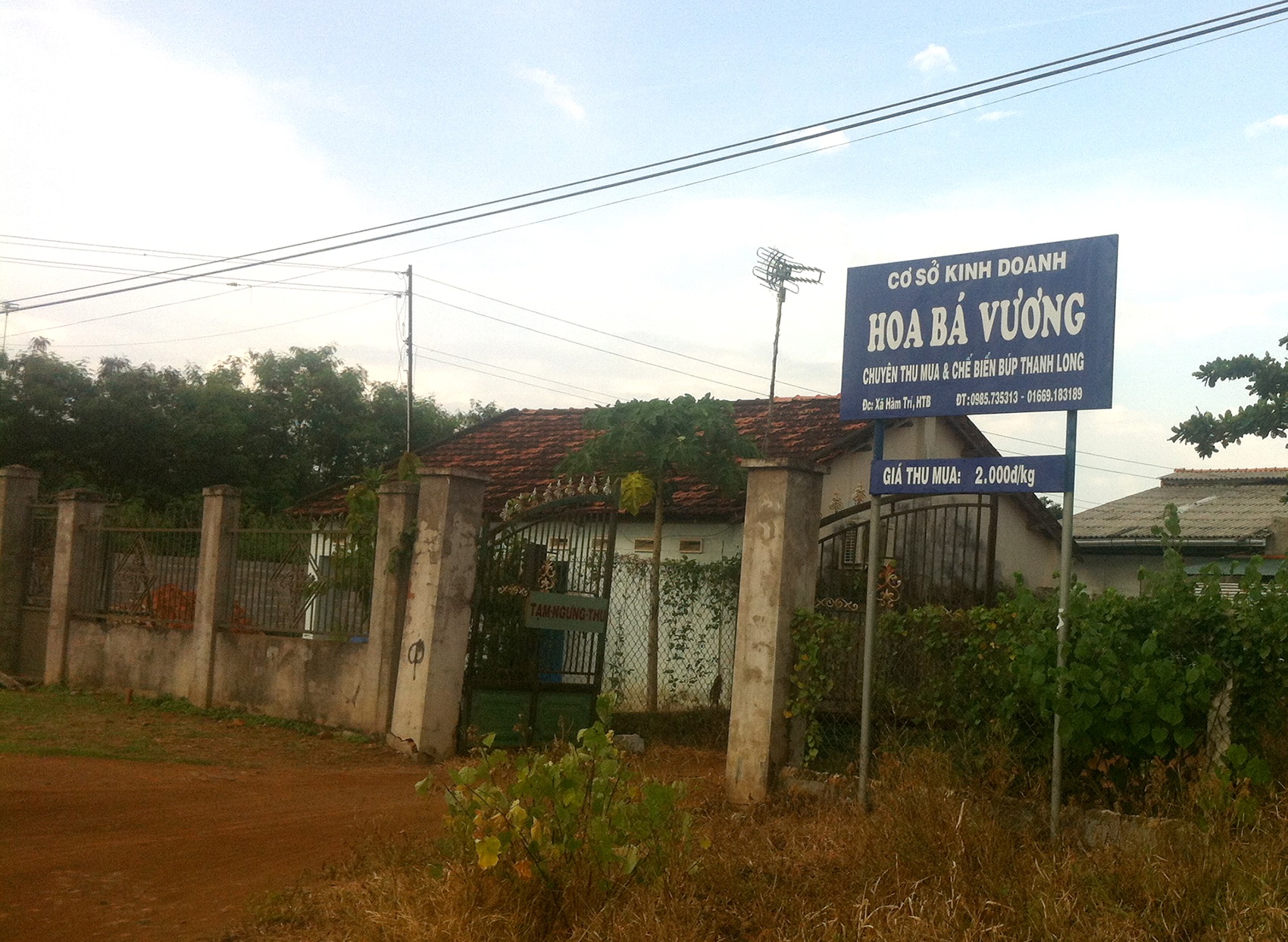 | Cơ sở sản xuất Hoa Bá Vương đóng tại thôn Phú Hòa, xã Hàm Trí, Hàm Thuận Bắc là điểm điều phối mọi hoạt động thu mua bông thanh long trên địa bàn tỉnh Bình Thuận. Đứng tên kinh doanh là người Việt, nhưng thực tế điều phối mọi hoạt động sản xuất là một người Trung Quốc tên A Vinh. |