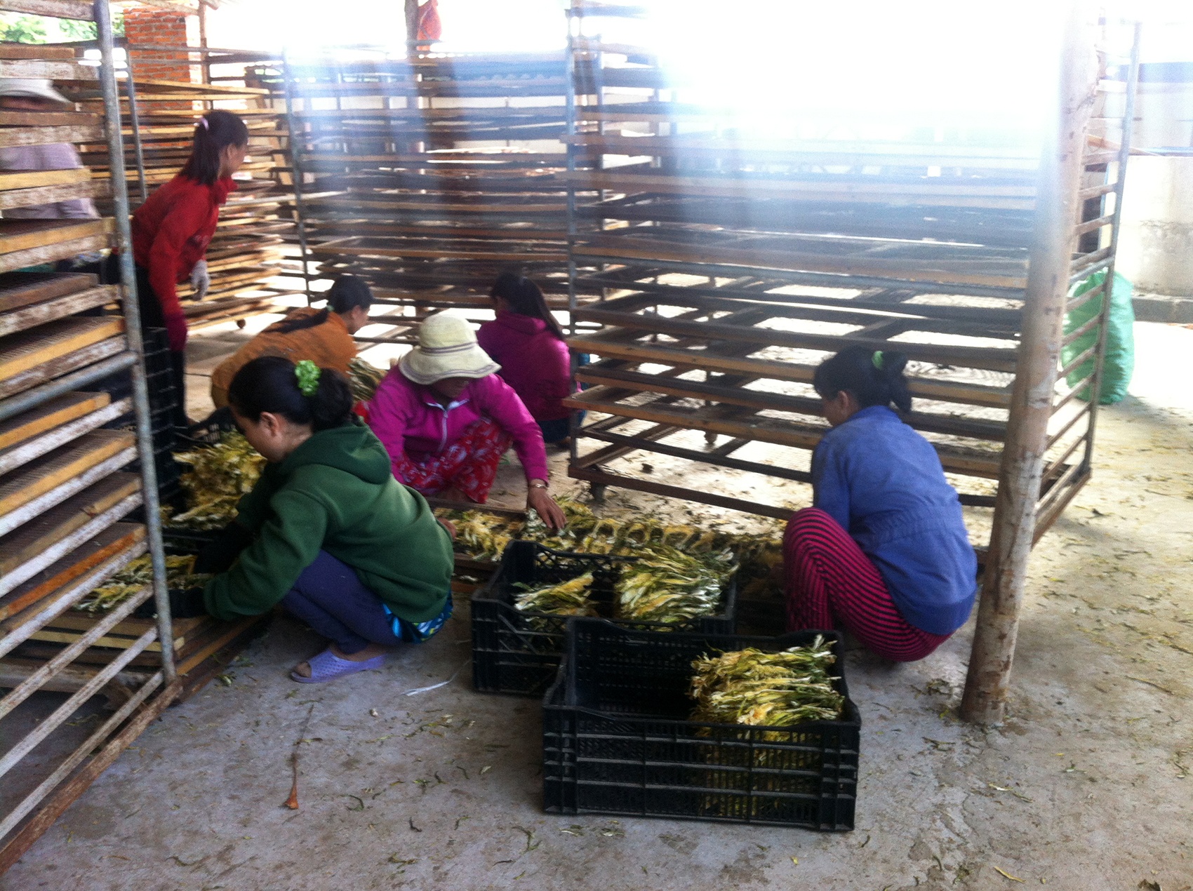 | Việc sơ chế này được thực hiện khá đơn giản, bông chẻ đôi sẽ đặt trên những khung lưới sắt rồi cho vào lò sấy khô. |
