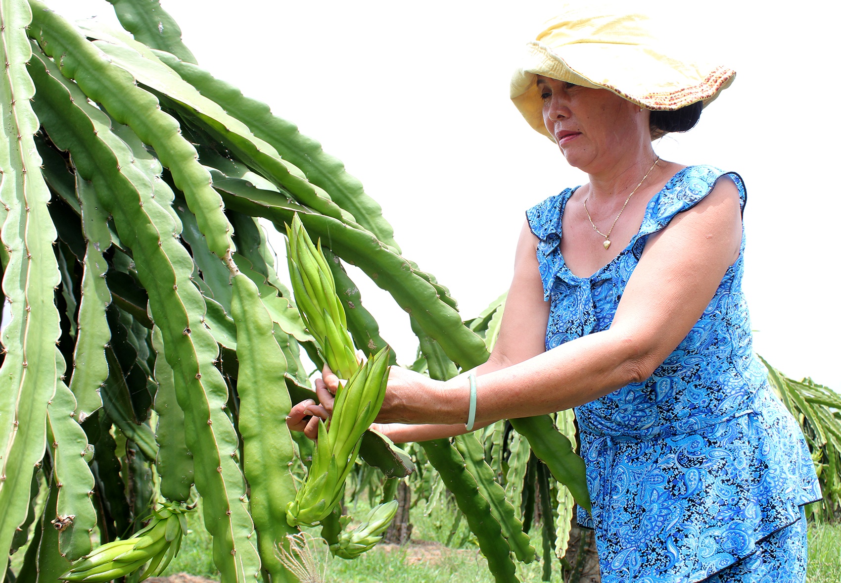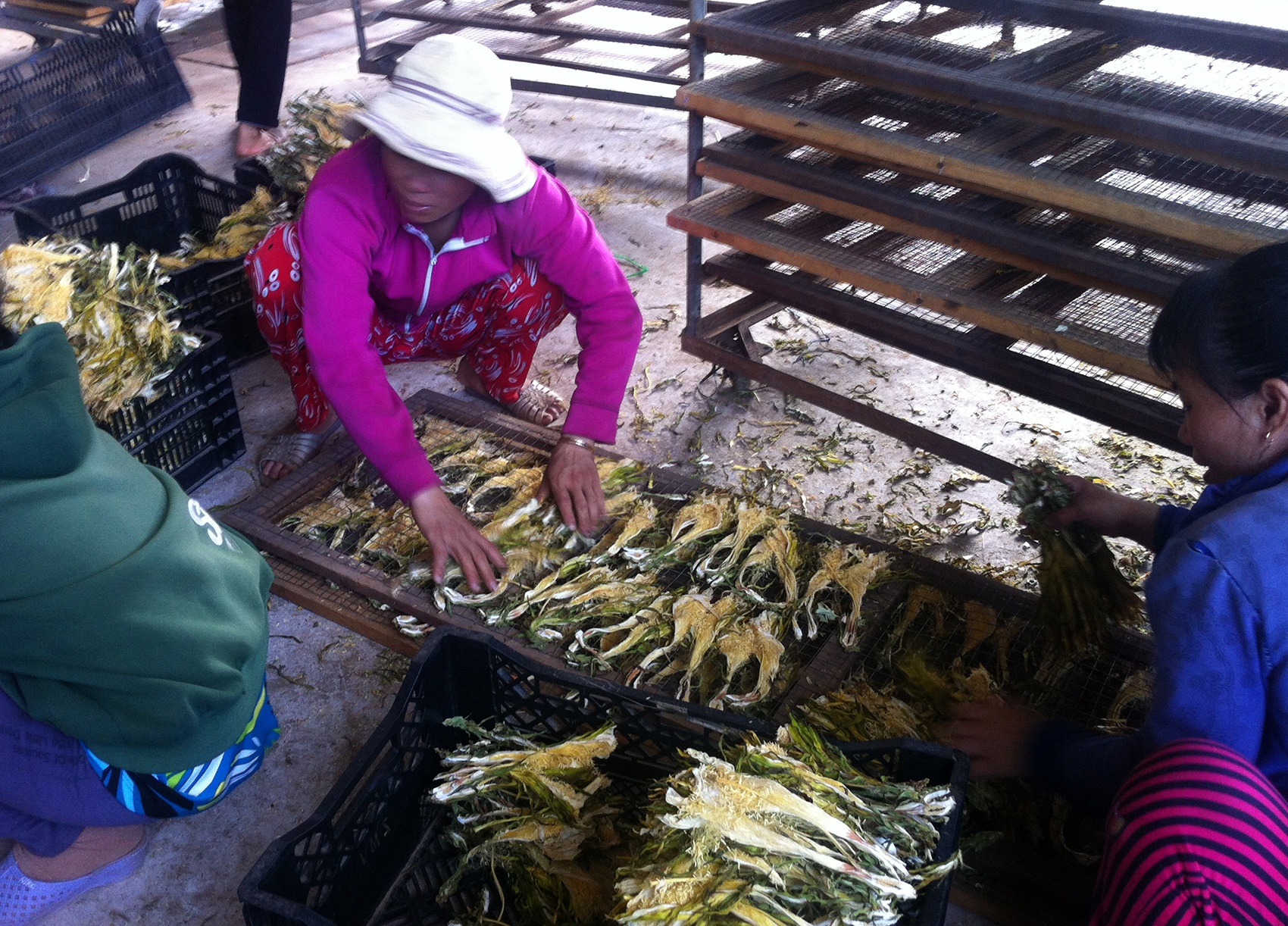 | Thường 11 kg búp thanh long tươi sau khi sấy sẽ ra 1 kg thành phẩm. Do không biết bông thanh long được thu mua, sấy khô để làm gì nên người dân ở đây đang đồn thổi về công dụng của loại này, như làm thuốc; làm thực phẩm với kiểu ăn như măng, nấu canh... |
