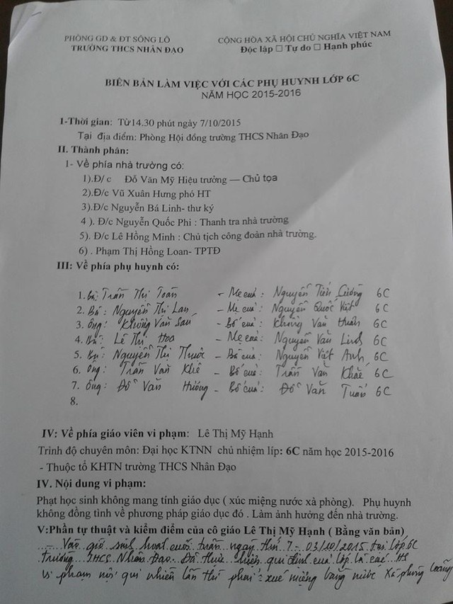 Biên bản làm việc giữa nhà trường và phía các bậc phụ huynh. Ảnh: Gia Đình & Xã Hội. |
