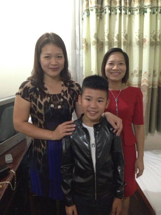 | Cô hiệu trưởng Đào Thu Hiền (áo đỏ) và cô chủ nhiệm Trịnh Thị Thu chụp ảnh lưu niệm cùng Ngọc Duy trước giờ biểu diễn đêm chung kết. |