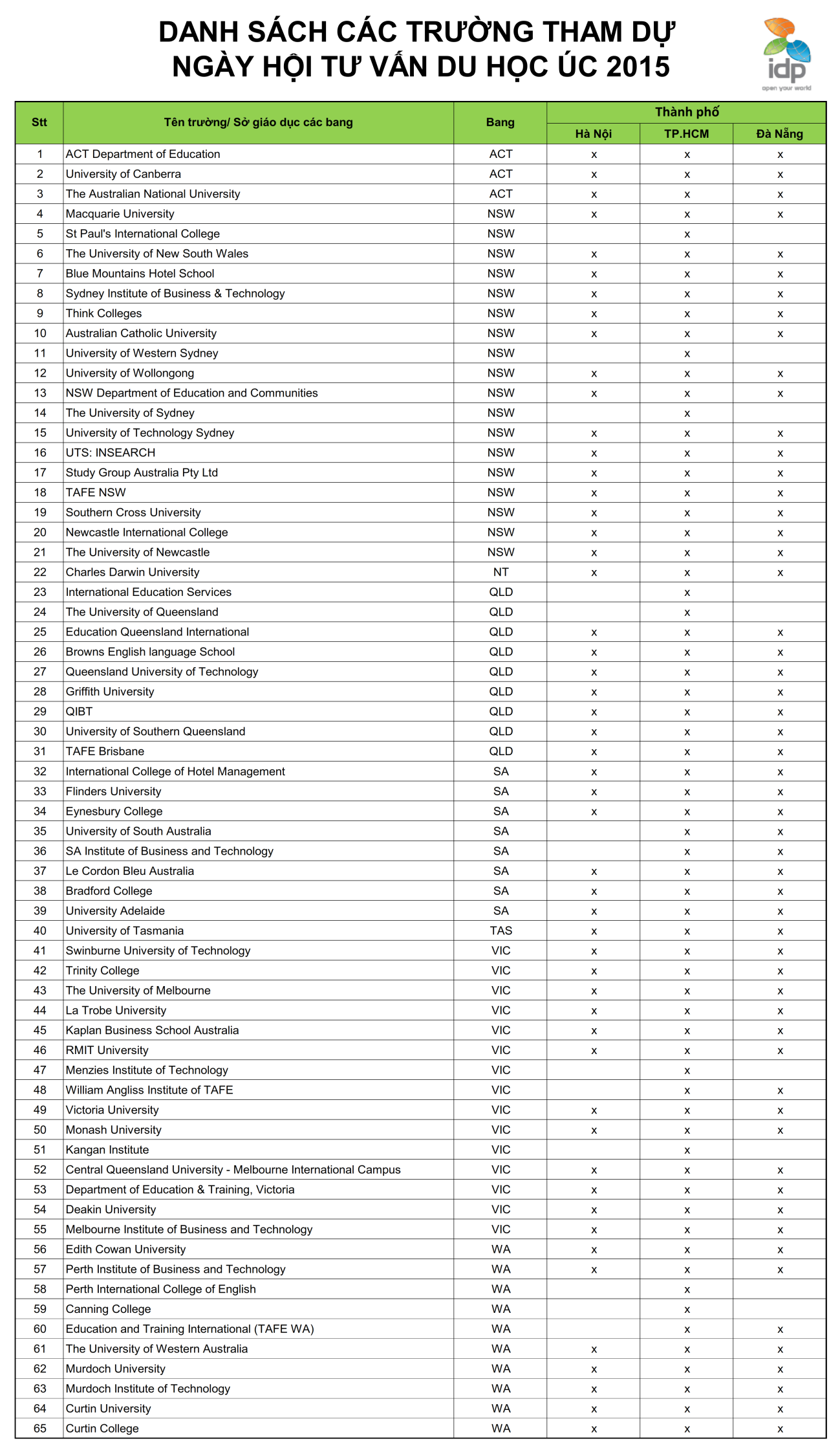 Australia có hệ thống giáo dục chất lượng cao và thu hút nhiều du học sinh của các quốc gia trên thế giới. Nhằm mang đến cơ hội cho HSSV Việt Nam tìm hiểu thêm về môi trường học tập tại đất nước chuột túi, IDP tổ chức Ngày hội tư vấn du học Úc. Đây là sự kiện tuyển sinh du học Australia lớn nhất trong năm, quy tụ hơn 70 trường ở tất cả bậc học, giúp HSSV gặp gỡ trực tiếp các đại diện trường và nhận được sự hỗ trợ cần thiết để du học thành công.