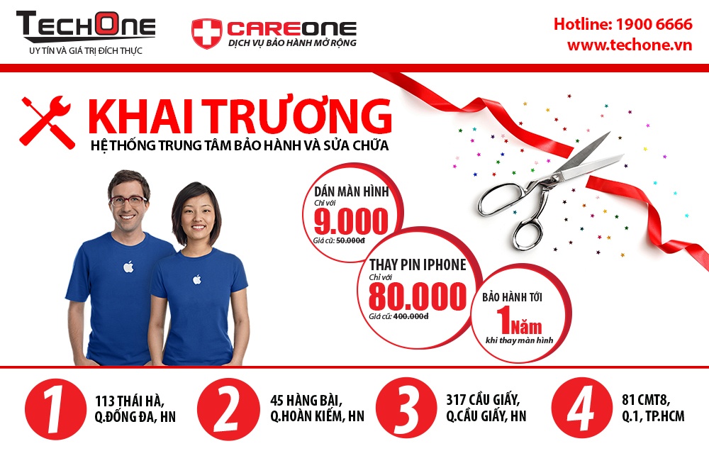 TechOne là thương hiệu phân phối điện thoại di động chính hãng từ lâu vẫn được người dùng tin tưởng, vì luôn mang đến những sản phẩm chính hãng với chất lượng đảm bảo và giá cả cạnh tranh. Nhằm phục vụ tốt hơn cho nhu cầu của khách hàng trong việc bào hành và sửa chữa điện thoại, máy tính bảng, laptop... Tháng 11, công ty khai trương thêm 4 trung tâm bảo hành tại 113 Thái Hà - Hà Nội, 45 Hàng Bài - Hà Nội, 317 Cầu Giấy - Hà Nội và 81 CMT8 - Q.1 - TP.HCM. Nhân dịp khai trương, từ 12/11 đến 30/11, TechOne gửi đến khách hàng chương trình khuyến mại, ưu đãi ngập tràn.