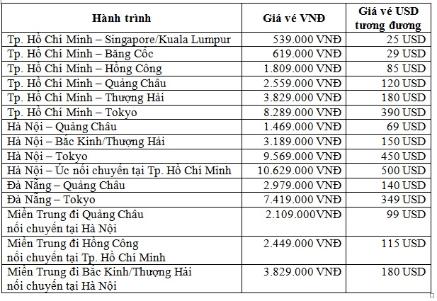 Khách hàng sẽ có cơ hội mua vé máy bay khứ hồi và khởi hành từ nay đến 31/3/2015 với mức giá đặc biệt chỉ từ 539.000 VNĐ (tương đương 25 USD) trên các đường bay quốc tế từ Hà Nội/TP.HCM/Đà Nẵng và các sân bay miền Trung đi Đông Nam Á, Đông Bắc Á và Úc.