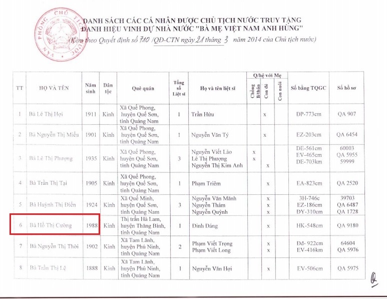 Điều đáng nói, trong danh sách có mẹ Hồ Thị Cường (thị trấn Hà Lam, huyện Thăng Bình, Quảng Nam) sinh năm 1988 (tức mới có... 26 tuổi) được truy tặng Bà mẹ Việt Nam Anh hùng vì có con trai duy nhất tên Đinh Đáng (số bằng Tổ quốc ghi công HK-548cm và số hồ sơ là QA 9180) là liệt sĩ.
