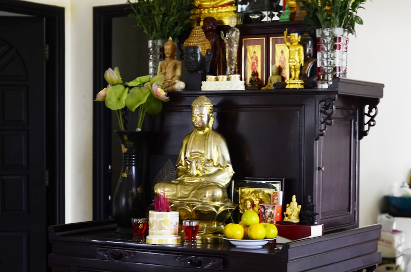 Bên trong căn nhà, một góc rộng ngay giữa phòng khách là vị trí ưu tiên đặt bàn thờ Phật.