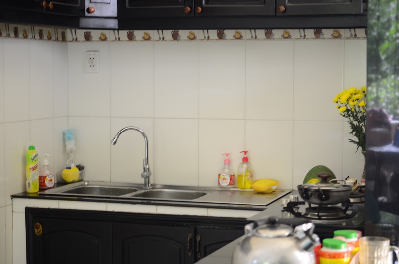 Phía sân sau của phòng bếp là bộ bàn ăn được làm bằng sắt rất cứng cáp và khá nặng, khó mà di dời. Ban ngày, bộ bàn ăn được trưng dụng cho việc phơi khô các dụng cụ làm bếp, sáng sớm và trưa sẽ là nơi Việt Trinh thưởng thức bữa cơm cùng cậu quý tử.