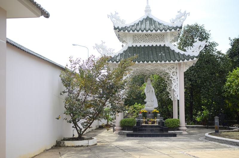 Nhìn từ phía ngoài, nơi ở của Việt Trinh giống với một ngôi biệt thự xa hoa lộng lẫy với khoảng không gian rộng rãi, tuy nhiên, khi bước vào trong, căn nhà của Người đẹp Tây Đô không hoành tráng như bên ngoài. Ngôi nhà hai mẹ con sinh sống nằm nhỏ gọn giữa một không gian vườn tược tươi tốt với nhiều loại hoa và cây ăn trái. Phía sau cánh cổng là khoảng sân trước nhà rất rộng, phía tay phải ngôi nhà là vị trí đẹp nhất được người đẹp chọn lựa để đặt một bức tượng Phật Bà Quan Âm. Việt Trinh cho biết, chị thỉnh bức tượng này từ chùa Non Nước về nhà riêng sau khi tham gia bộ phim Duyên trần thoát tục. Chị có thói quen trước và sau khi đi làm về đều tới lễ tại tượng Phật này để cầu xin sự bình an, may mắn.