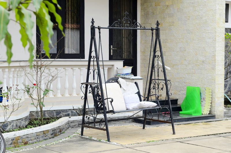 Không gian rộng cho phép chị tạo ra nhiều vị trí thư giản, tận hưởng thiên nhiên vào mỗi sáng sớm. Thêm một chiếc xích đu sắt được đặt bên trái gian nhà gần với khu vườn rộng rãi.