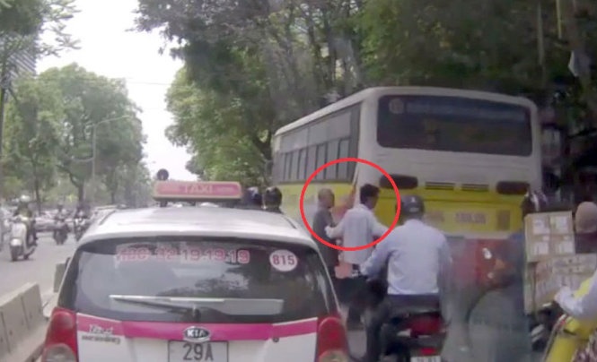 Clip được trích từ camera hành trình của một chiếc ô tô, ghi lại cảnh taxi đang di chuyển trên phố tấp nập tại Hà Nội đột nhiên dừng lại.