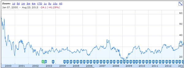 | Từ khi Ballmer lên điều hành, cổ phiếu Microsoft mất hơn 40% giá trị. Loại trừ cổ phiếu suy giảm năm 2000 do với bong bóng dot-com thì cổ phiếu hầu như không tăng trưởng. |