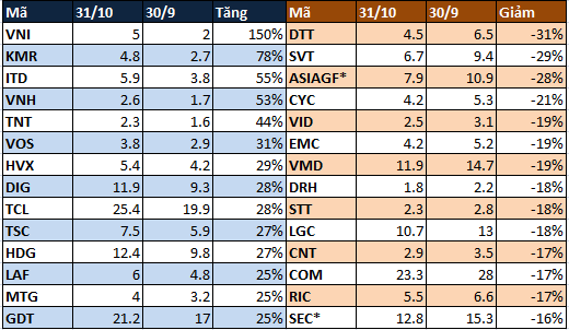 | Các cổ phiếu tăng giảm nhiều nhất sàn HoSE trong tháng 10. |