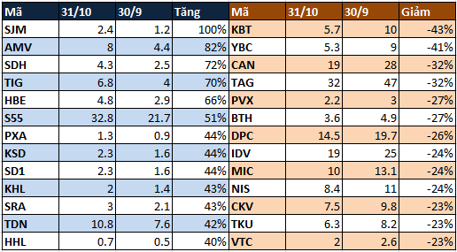 | Các cổ phiếu tăng giảm nhiều nhất sàn Hà Nội trong tháng 10. |