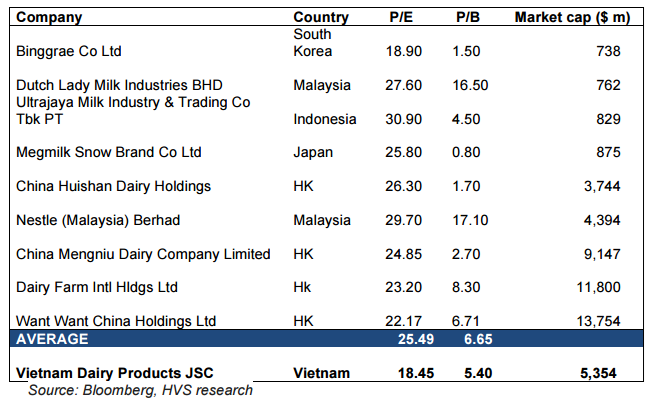 Với mức giá 115.000 đồng/cổ phiếu, VNM đang được giao dịch với mức P/E là 18,45 là gấp 5,4 lần giá trị sổ sách. Nếu xét trên khía cạnh chỉ số P/E và P/B, VNM dường như rẻ hơn so với các công ty cùng ngành nghề trong khu vực châu Á.