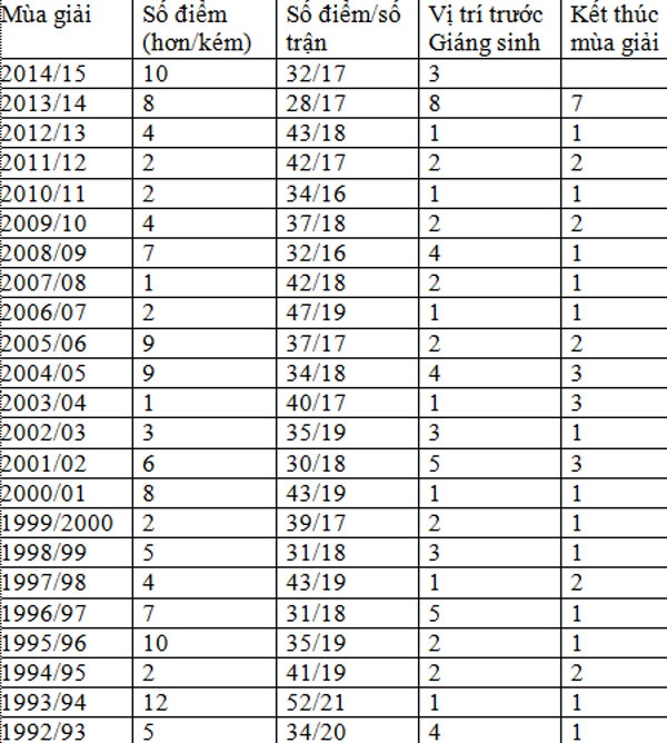 Thành tích thi đấu của M.U trước Giáng sinh qua các mùa giải