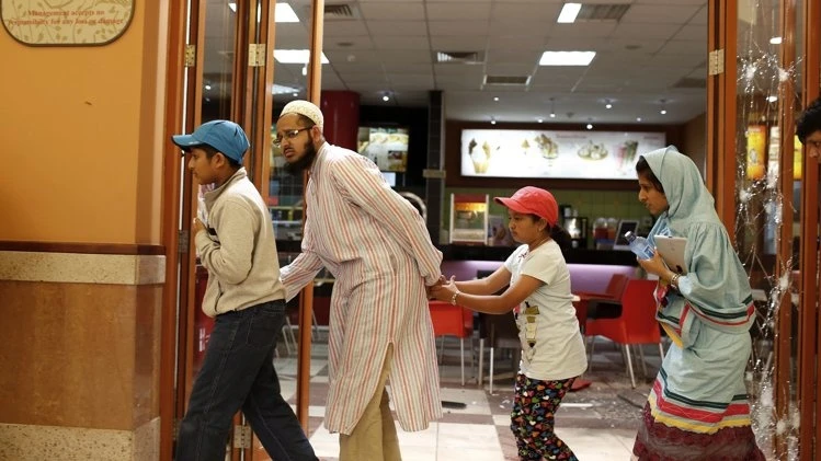 | Một nhóm người rời khỏi khu mua sắm Westgate sau khi bọn khủng bố cho phép họ chạy ra ngoài vào hôm 21/9. Ảnh: Reuters. |