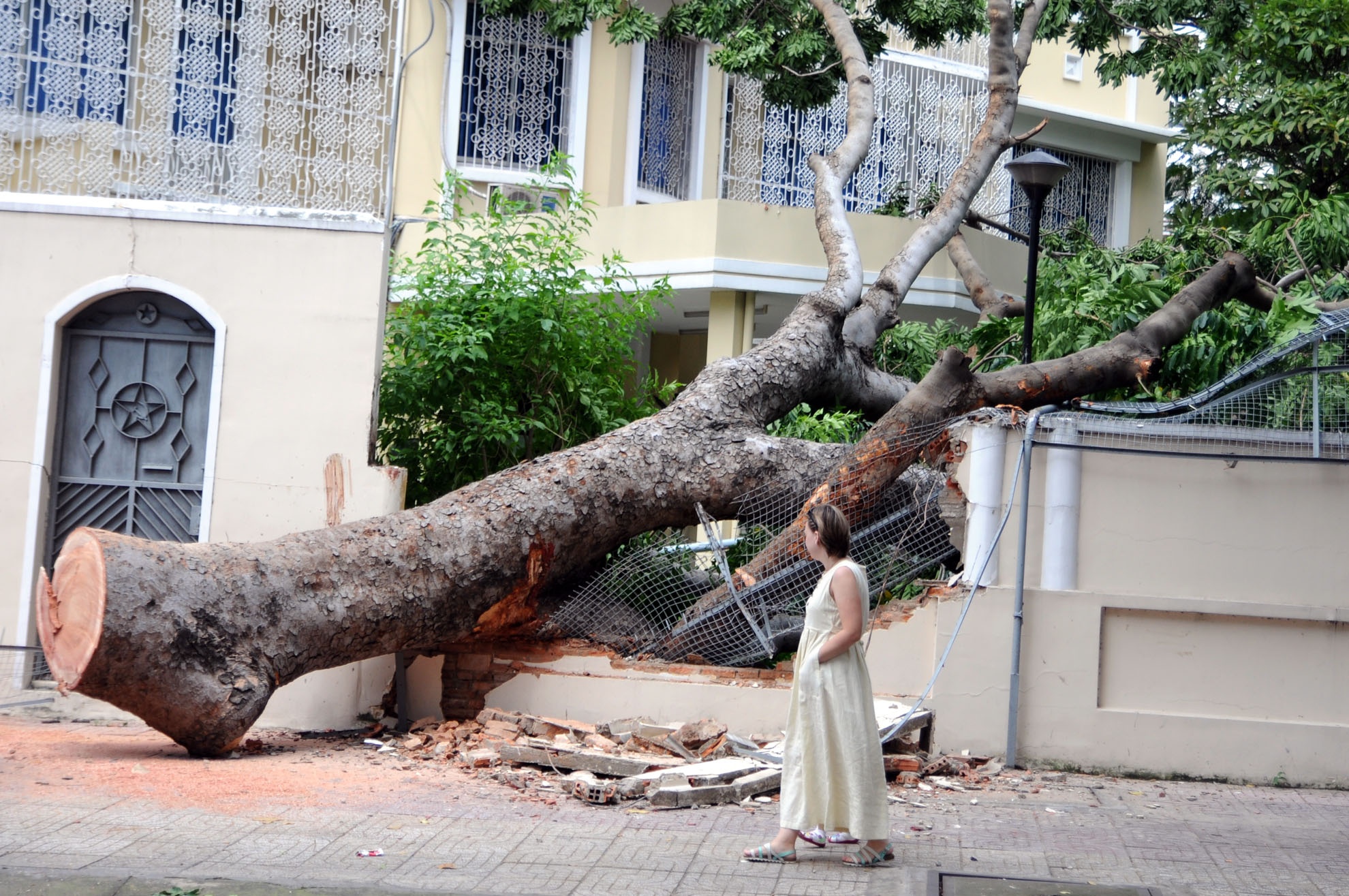 Khoảng 11h ngày 23/9, cây xanh có đường kính khoảng 1 m, cao trên 20 m bất ngờ bật gốc đổ ập xuống đè sập tường của một tòa nhà trên đường Bà Huyện Thanh Quan (quận 3, TPHCM).