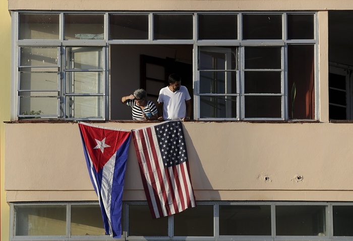 Người dân Cuba xem lễ kéo cờ trên nhà cao tầng. Theo Ngoại trưởng Cuba Rodriguez, hai bên có những thay đổi tích cực trong quan hệ là nhờ sự lãnh đạo sáng suốt của lãnh tụ Fidel Castro cũng như sự quyết tâm và bền bỉ của người dân Cuba.