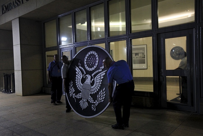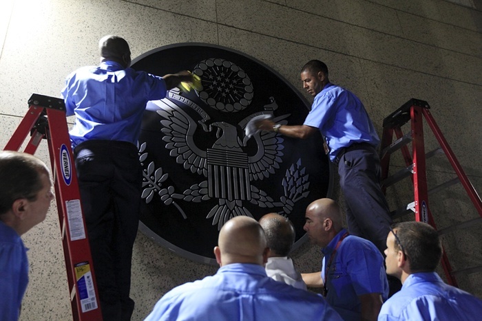Trước bình minh, các nhân viên chuyển chiếc khiên - biểu tượng của nước Mỹ - tới trước đại sứ quán. Người phát ngôn Nhà Trắng Josh Earnest tuyên bố chính quyền Tổng thống Obama hoan nghênh việc hai nước chính thức khôi phục quan hệ ngoại giao song phương.