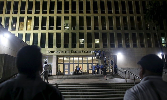 Nhân viên gắn dòng chữ "Đại sứ quán Mỹ" bên trên lối vào của trụ sở. Trước đó, Mỹ cũng nâng cấp Phòng Đại diện Quyền lợi Mỹ thành Đại sứ quán ở thủ đô Havana.