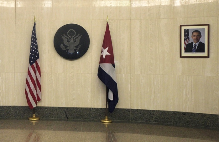 Mọi công tác chuẩn bị bên trong đại sứ quán đều đã hoàn tất. Quốc kỳ Mỹ và Cuba được đặt cạnh bức chân dung của Tổng thống Barack Obama tại sảnh vào của trụ sở.