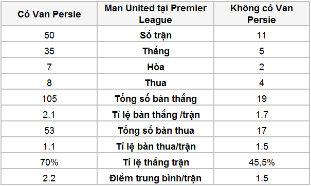 Thống kê cho thấy (bảng dưới), Van Persie ra sân tỉ lệ chiến thắng của M.U lên đến 70%. Còn khi anh vắng mặt tỉ lệ này chỉ là 45,5%. Có chân sút người Hà Lan, M.U đạt 2,2 điểm/trận; không có anh tỉ lệ này chỉ là 1,5 điểm/trận.