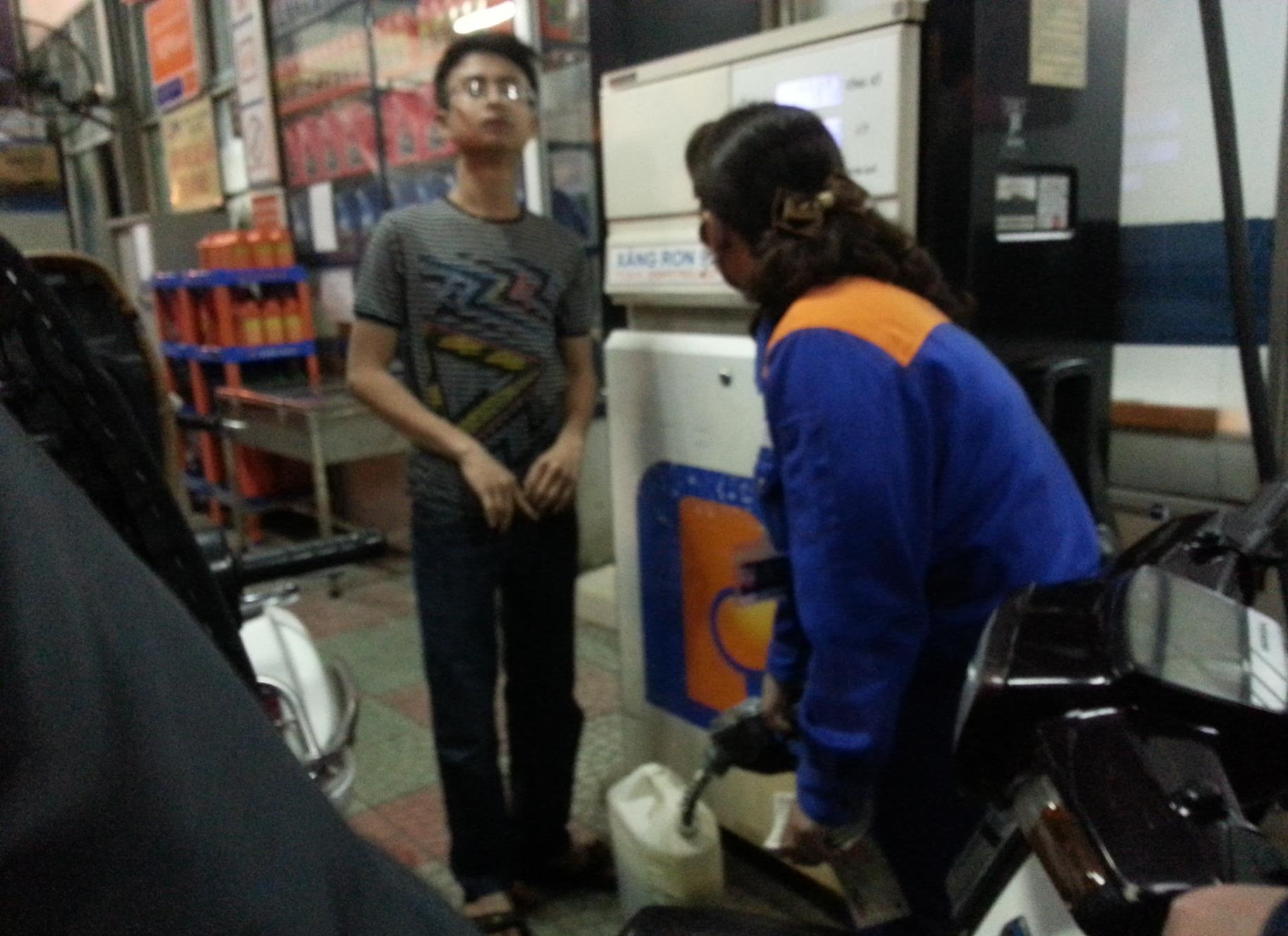 | Khi gần hết xăng, thanh niên này mang can 20 lít vào trạm tiếp xăng. |