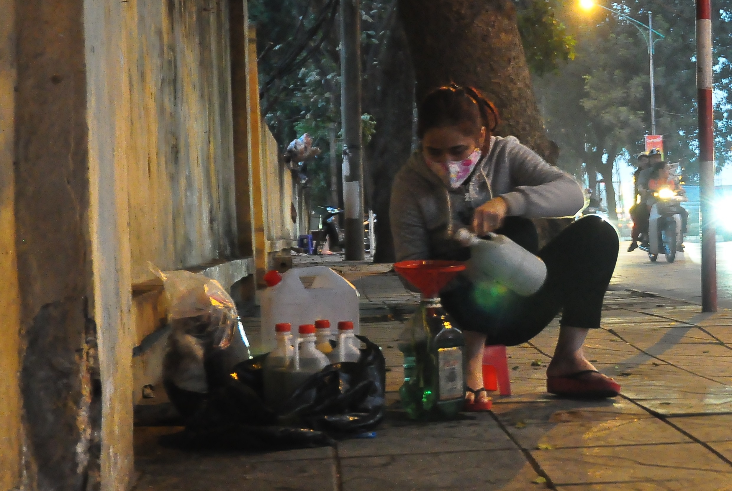 | Một người chuyên ngồi sang chiết xăng để tiếp tế cho đội quân cò xăng. |