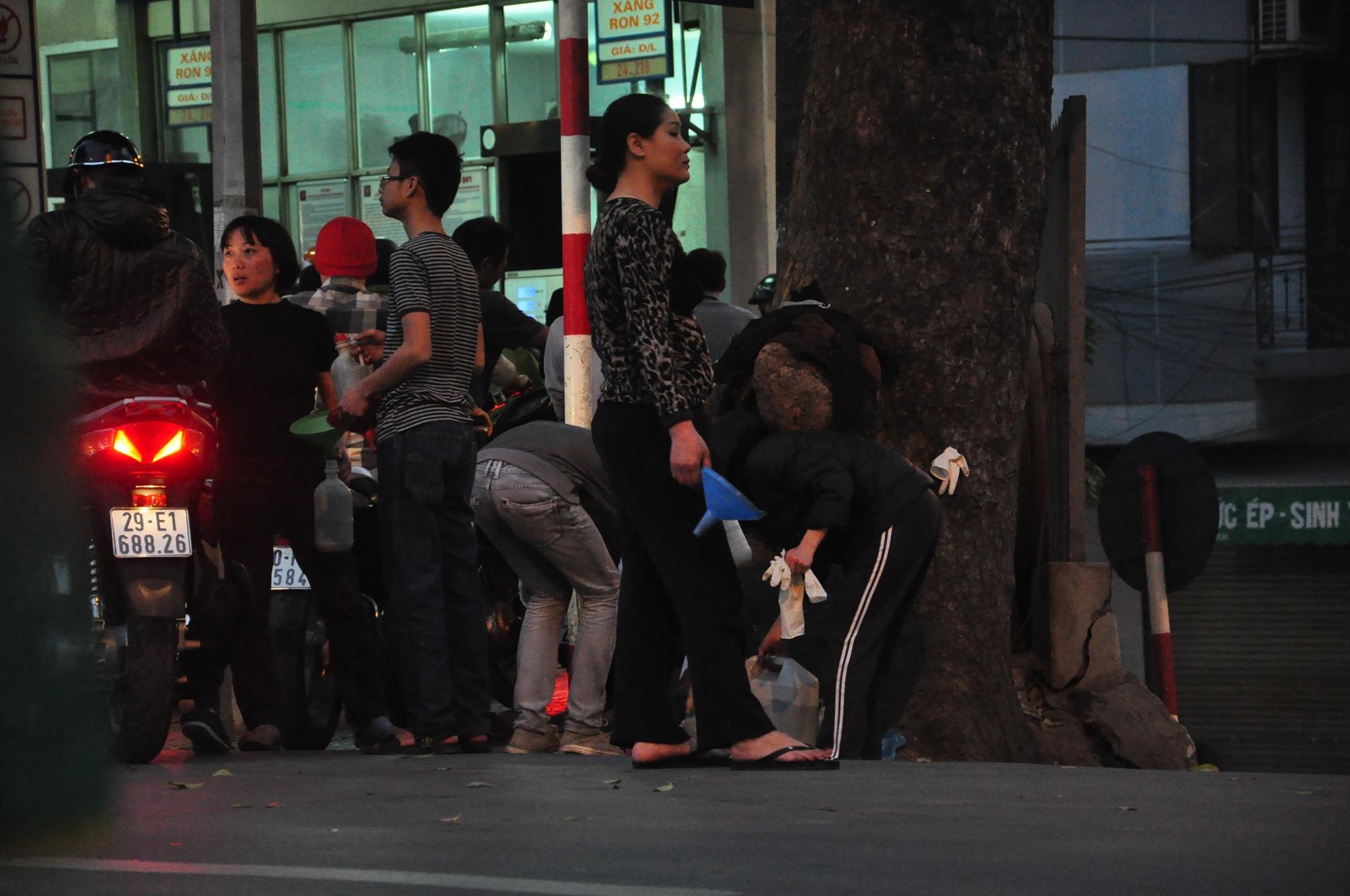 | Đội cò xăng tụ tập lấy hàng để bên gốc xà cừ sát cổng vào cây xăng Hàng Bún. |