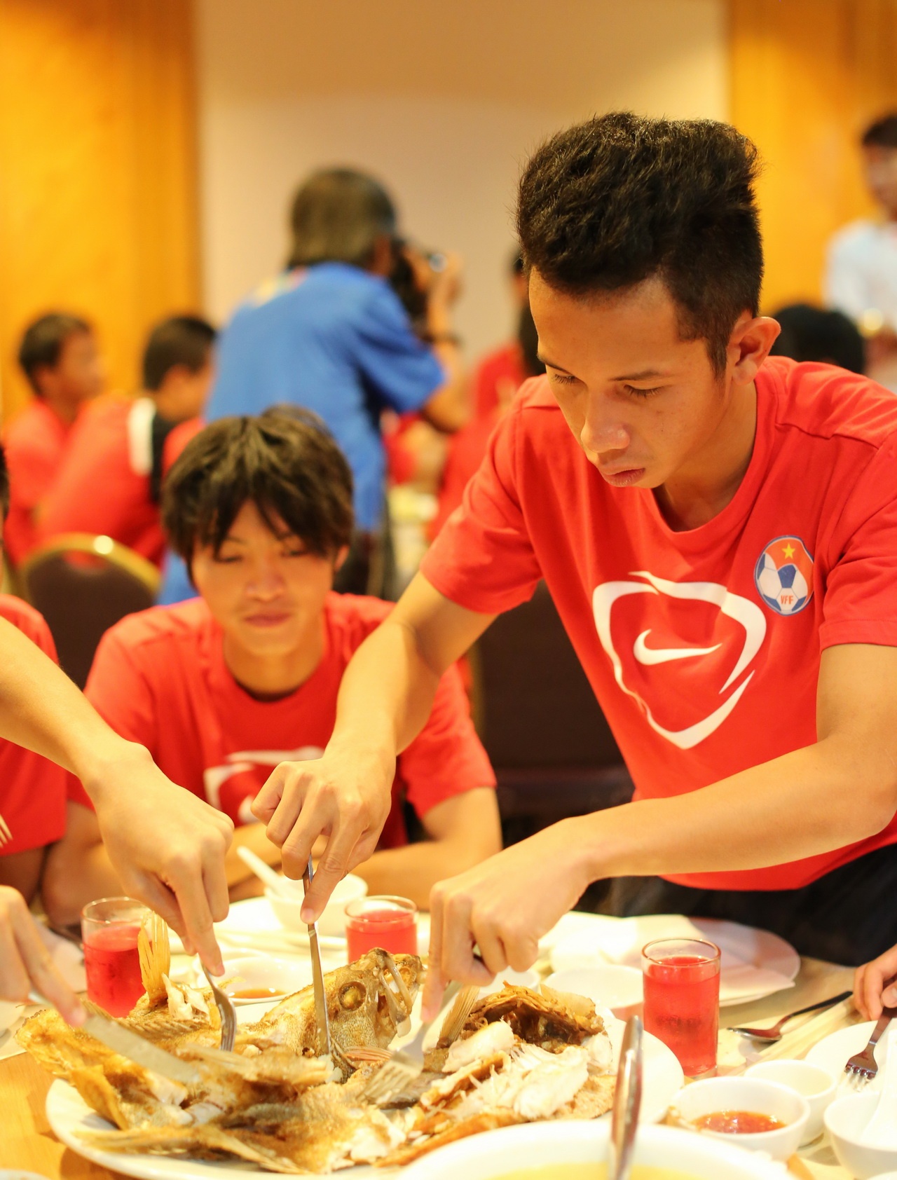 | Các cầu thủ U19 Việt Nam "khoái khẩu" với món cá. |