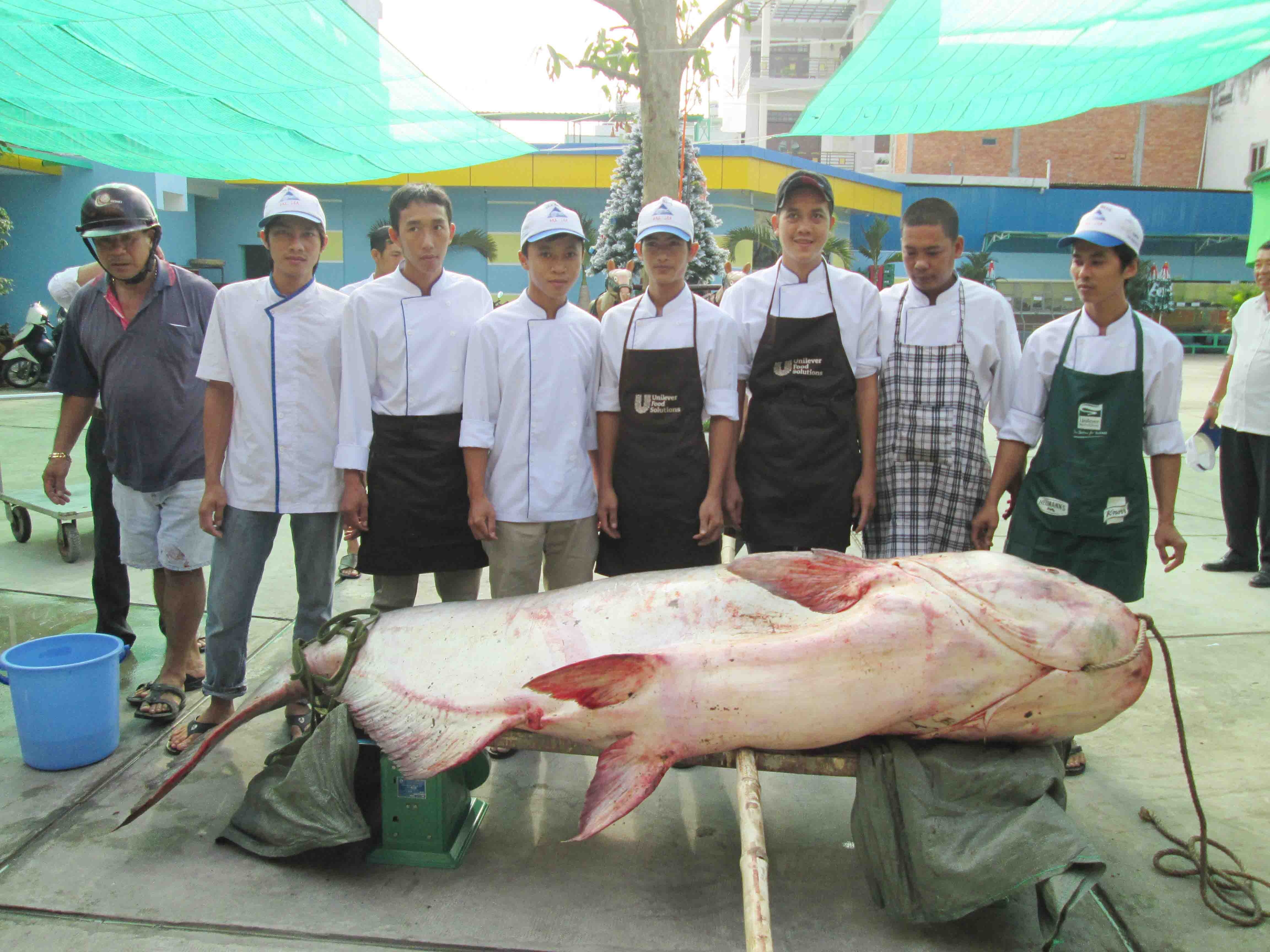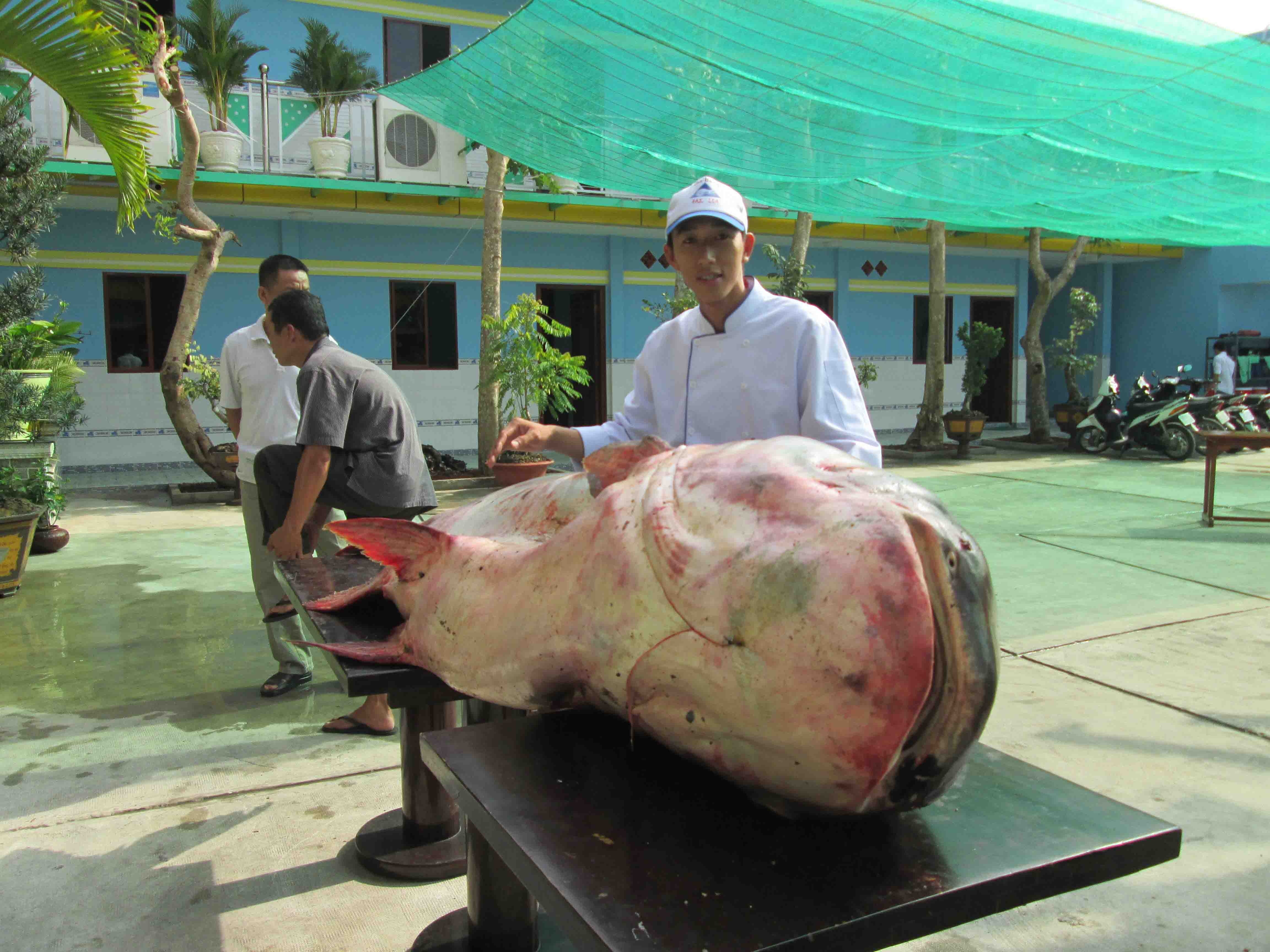 ...Nhưng đây là con cá cá tra dầu “khủng” nhất từ trước đến nay mà nhà hàng mua được. Trong ảnh: Con cá tra đầu dầu dài gần 3m.