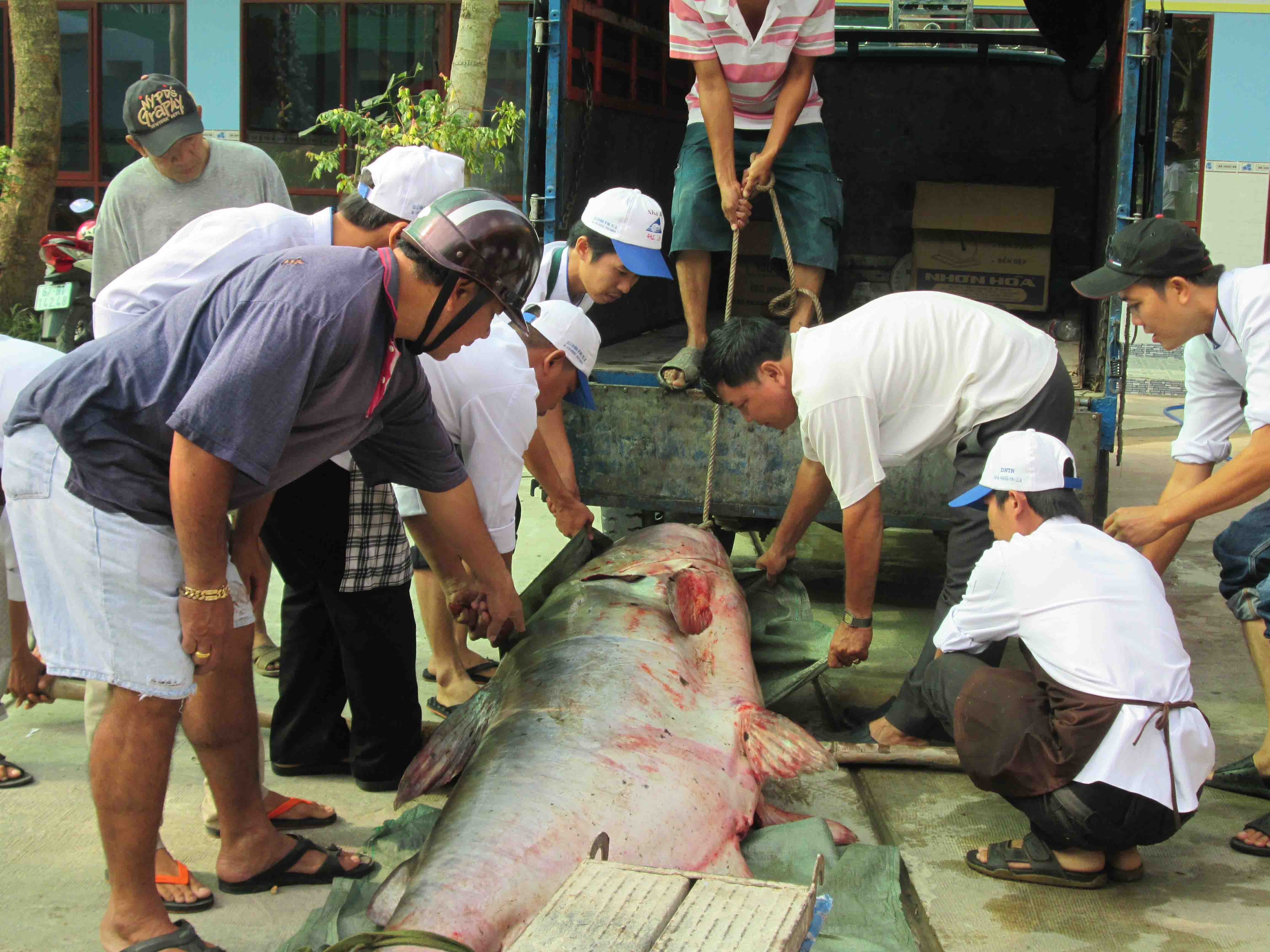 Một nhà hàng ở miền Tây vừa thu mua con cá tra dầu nặng gần 250kg của ngư dân đánh bắt được trên vùng Biển Hồ (Campuchia).