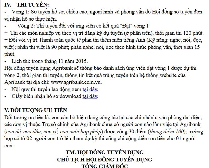 Agribank cho biết, ứng viên sẽ phải trải qua vòng 1 sơ tuyển hồ sơ, chiều cao, ngoại hình và phỏng vấn do Hội đồng sơ tuyển đơn vị nhận hồ sơ thực hiện. Vòng 2, các ứng viên có kết quả "đạt" ở vòng 1 sẽ thi tuyển các môn nghiệp vụ theo vị trí đăng ký dự tuyển...