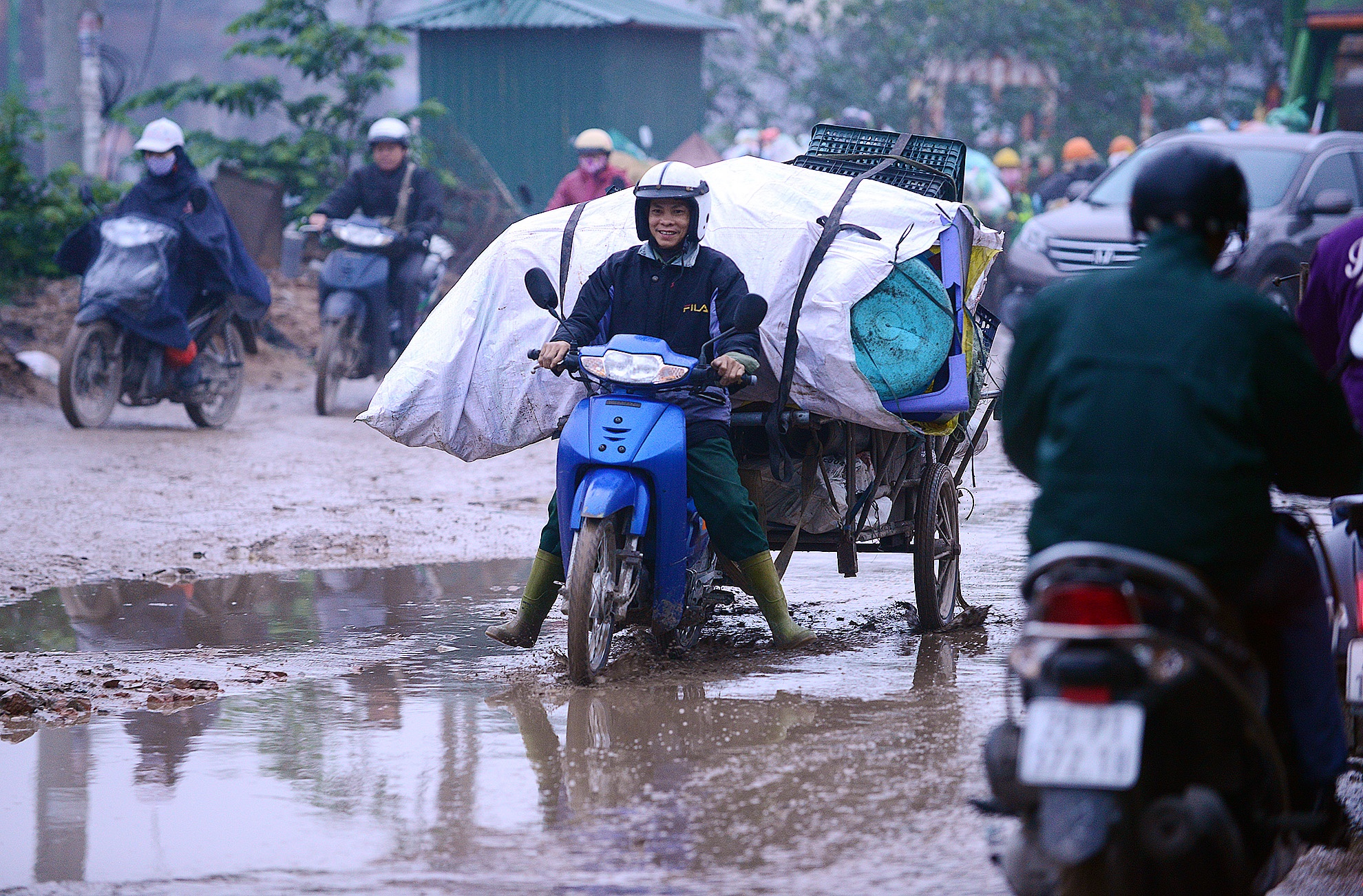 "Đi quãng đường có mỗi mấy trăm mét mà mất gần 30 phút", anh Kiên, một thợ chuyên chở hàng hóa thuê than thở.