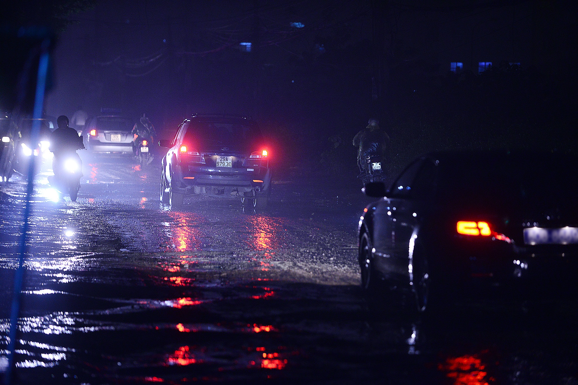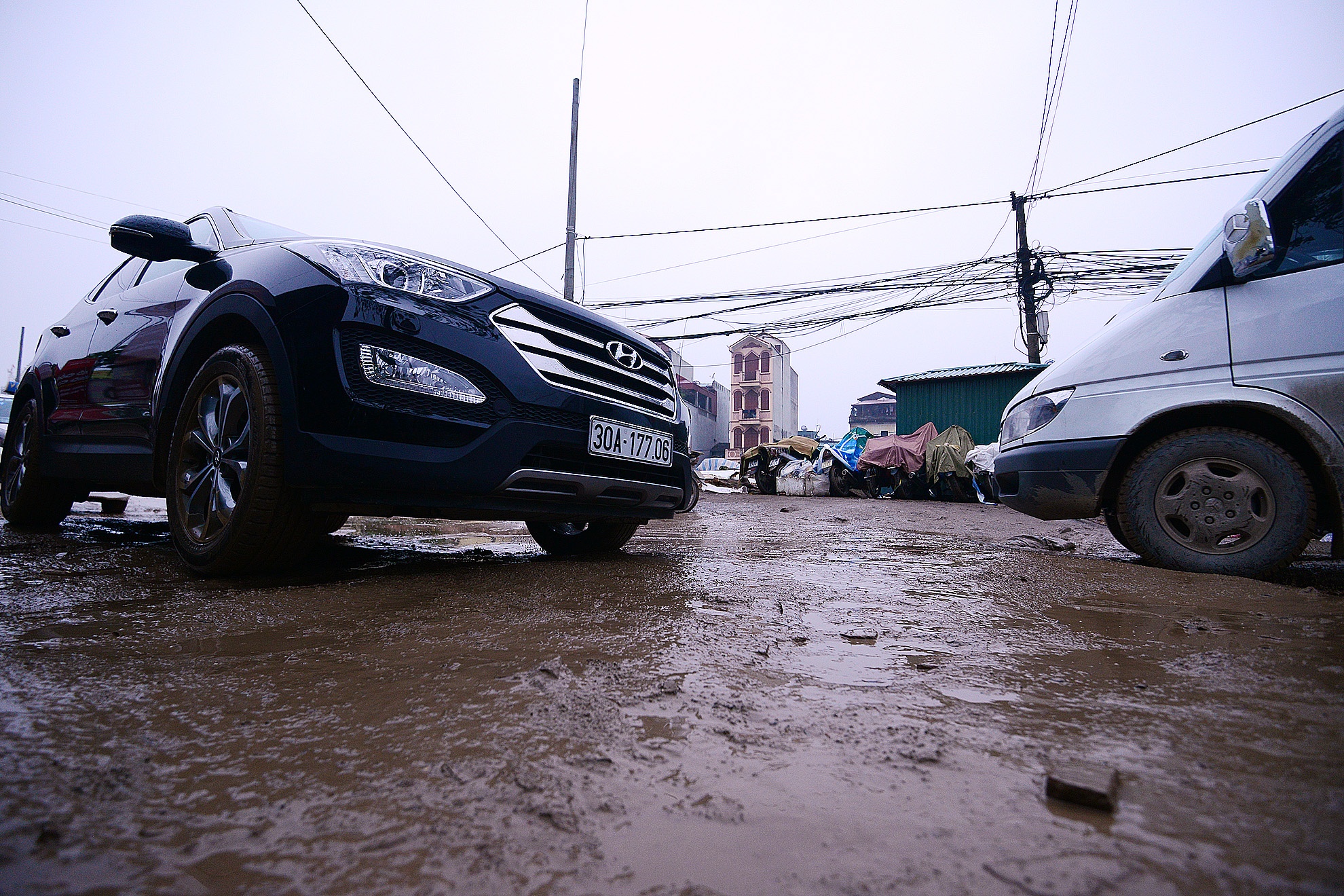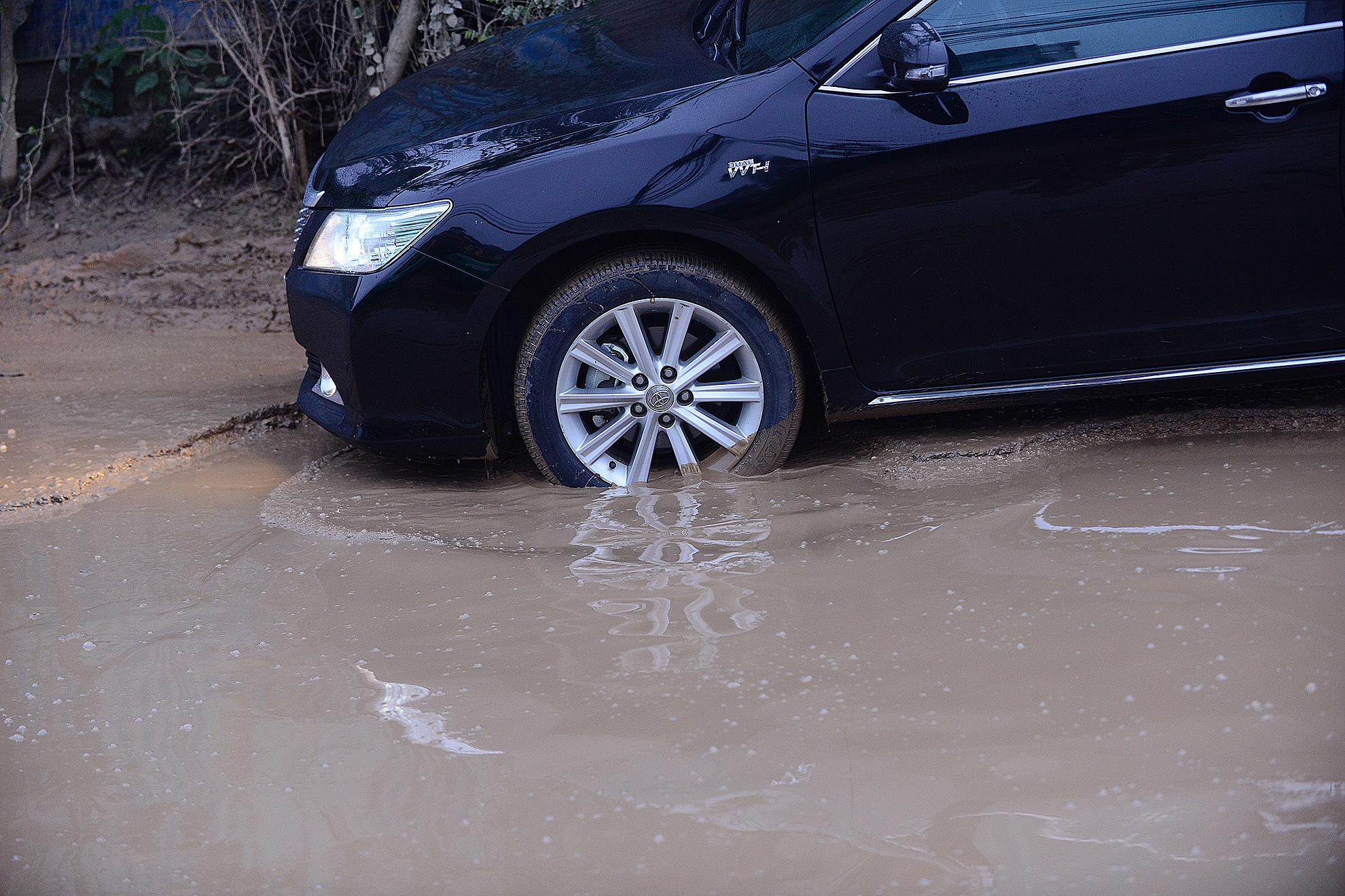 | Có những hố nước ngập gần nửa bánh ôtô. Xe loại nhỏ rất dễ bị chạm gầm. |