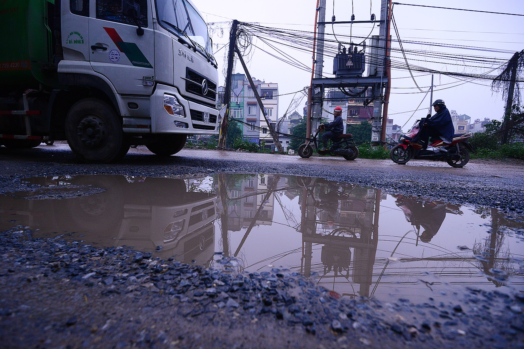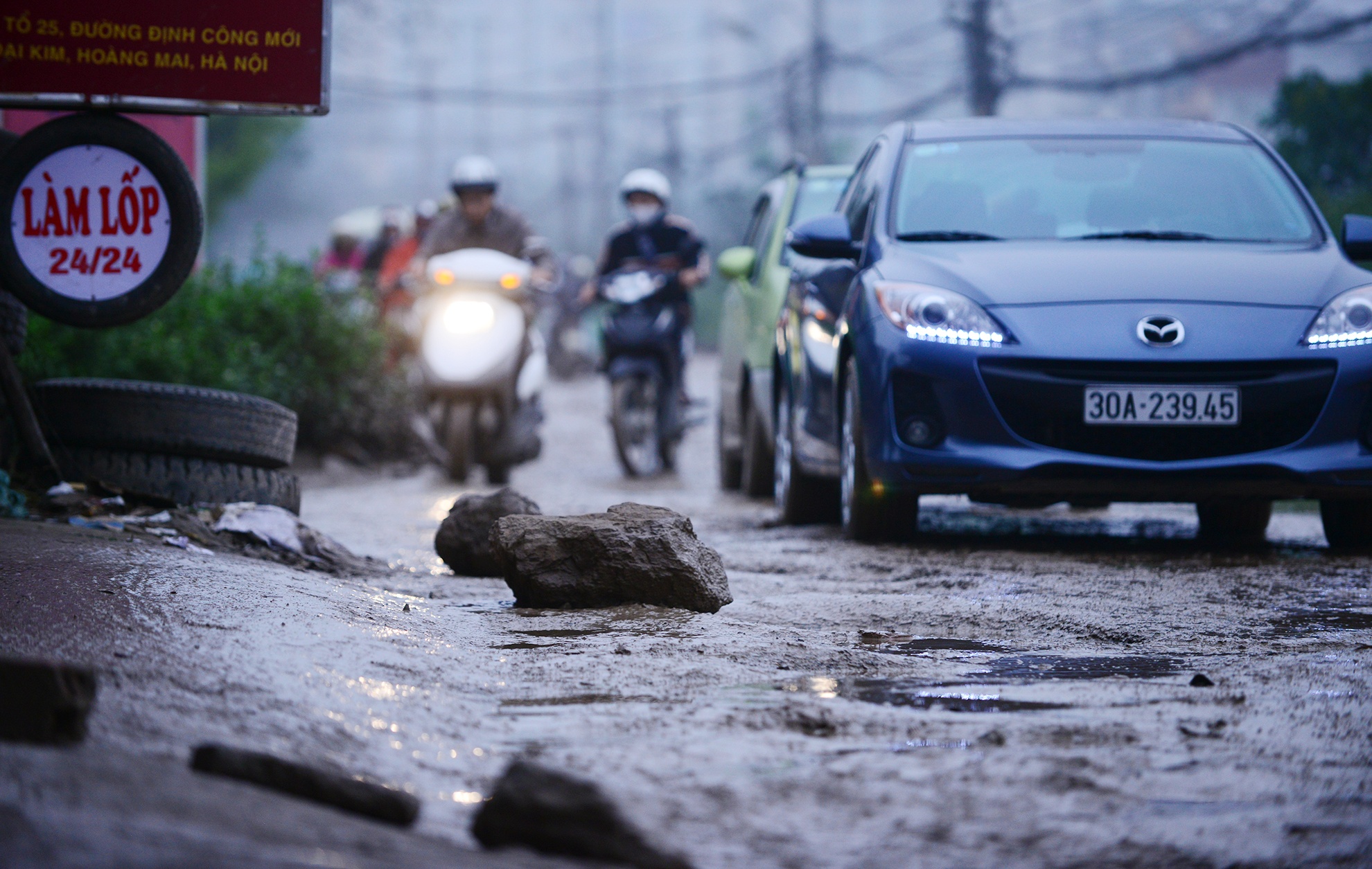 Mỗi khi mưa xuống, tuyến đường nối hai khu đô thị Định Công và Đại Kim lại trở nên nhầy nhụa cùng nhiều ổ voi, ổ gà gây khó khăn cho các phương tiện qua lại cả ngày lẫn đêm.