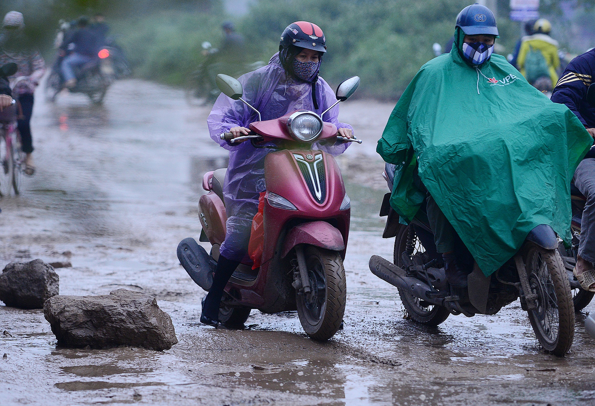 | Những người làm việc ven đường phải đặt đá hộc cạnh những hố lớn để cảnh báo các phương tiện. |