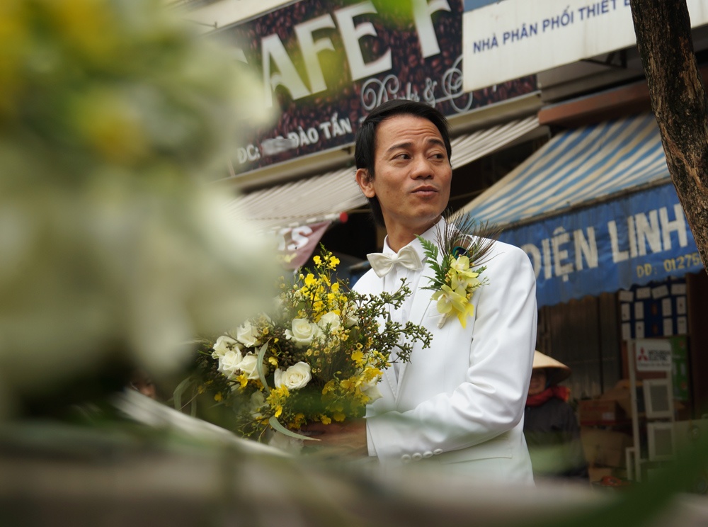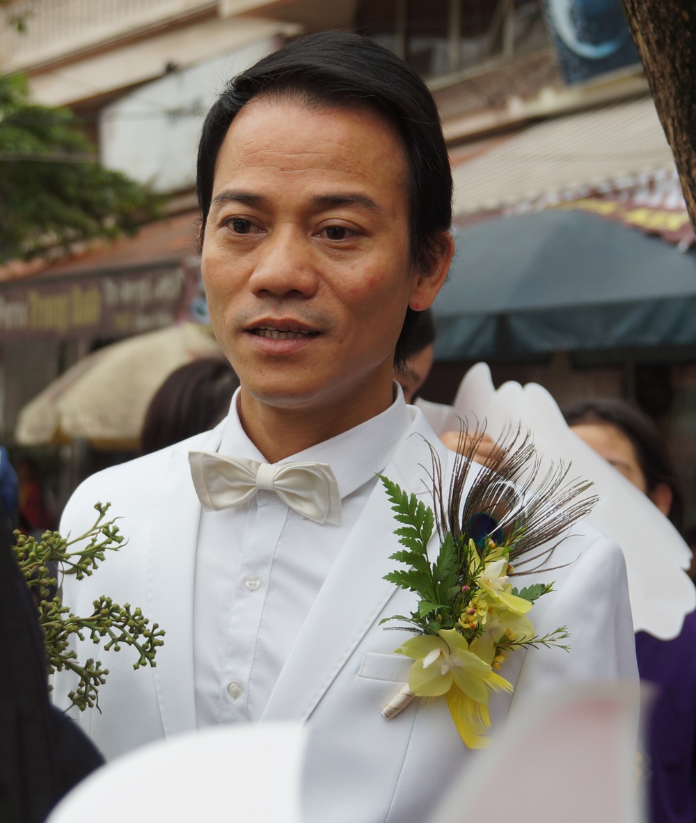 | 8h ngày 14/3, chú rể Chế Phong diện vest trắng bảnh bao để đi từ Đào Tấn sang nhà gái nằm trên đường Nguyễn Trãi. |