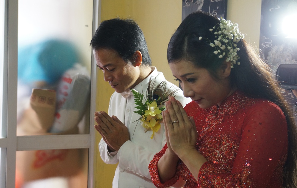 | Thanh Thanh Hiền và Chế Phong làm lễ trước bàn thờ gia tiên. Nói về người bạn đời của mình, nữ diễn viên nổi tiếng đất Bắc chia sẻ: "Cách quan tâm của anh ấy làm tôi thích, rồi sau đấy, anh quan tâm đến những người sống xung quanh tôi. Điều đó làm tôi cảm thấy anh là người rất đáng yêu trong mắt mình, vì anh không chỉ biết đến riêng tôi". |