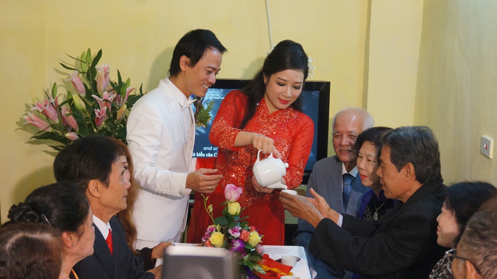 | Cặp tân lang, tân nương rót trà mời khách. Điều đáng tiếc là danh ca Chế Linh không có mặt trong đám cưới của con trai. Ông có buổi biểu diễn tại Quy Nhơn vào đúng ngày 14/3. Chế Linh cho hay, ông tin Chế Phong sẽ thông cảm với sự vắng mặt vì công việc. |